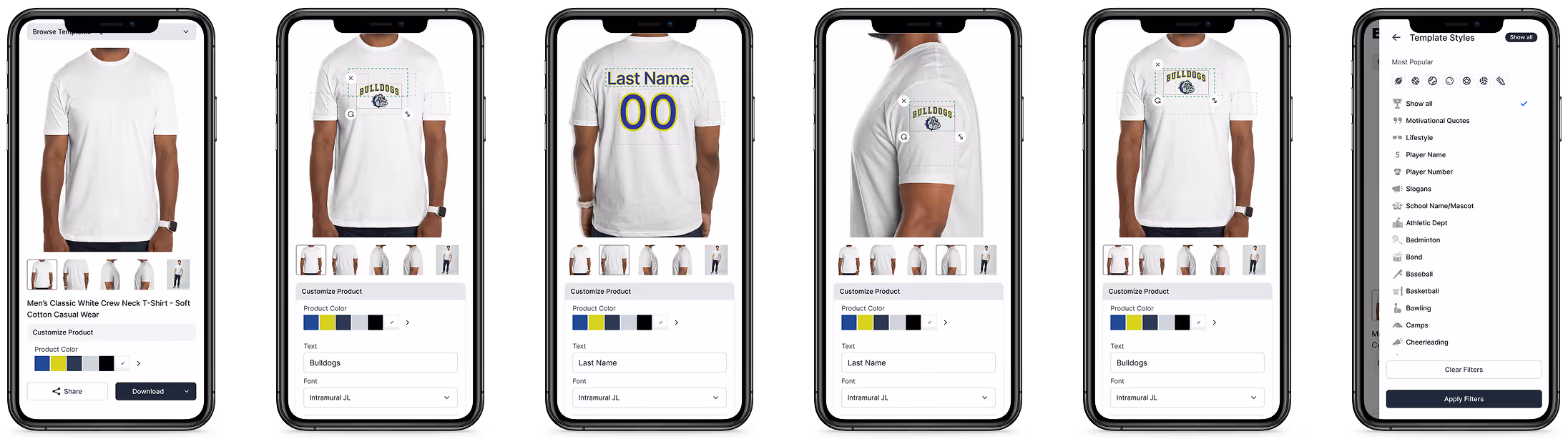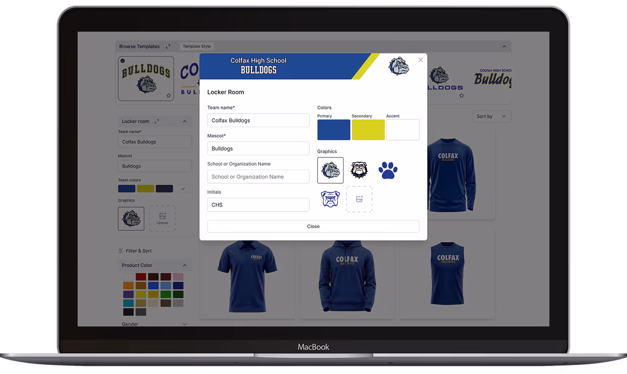 Features included live artwork previews, dynamic color updates, and sorting/filtering across apparel categories. The interface recognized which team a user belonged to, automatically applying appropriate logos, palettes, and templates.